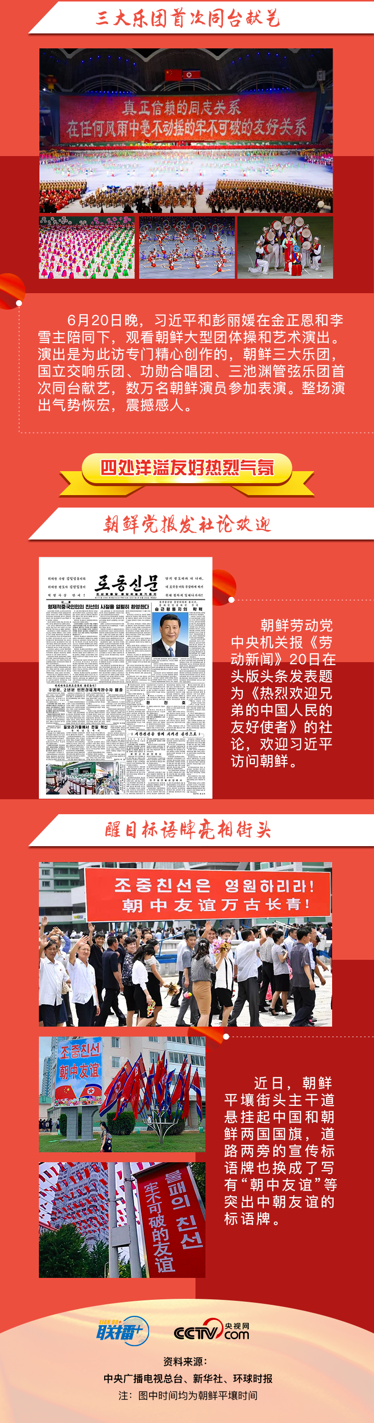 从金正恩和夫人亲自到机场迎接、数十万人夹道欢迎,到首次为外国领导人在锦绣山太阳宫广场举行致敬活动,再到为此访专门创作演出、朝鲜三大乐团首次同台献艺……朝鲜人民怀着无比喜悦的心情,热烈欢迎习近平的到来。