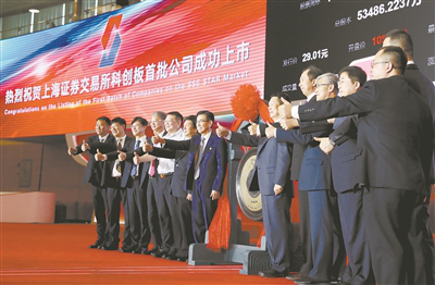 2019年7月22日上午9点30分许,伴随开市锣声的响起,首批25只科创板股票在上海证券交易所上市交易,科创板正式开市,这是上市企业代表在台上合影。新华社记者方喆摄